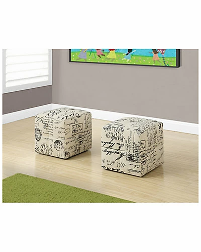 - Design details: Made from foam, solid wood, linen; Set of 2 juvenile ottomans; Upholstered in an elegant printed vintage script on cotton-linen material; Comfortably padded for sitting; 4 solid plastic feet for added stability