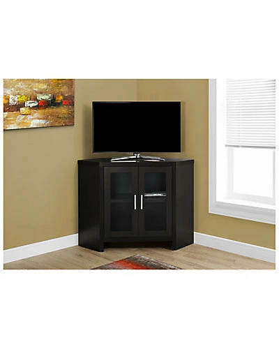 - Design details: Made from particle board, glass, hollow-core, laminate, MDF, tempered glass; Space saving corner design is perfect for small spaces; 2 storage shelves for electronic components and accessories; Stylish glass cabinet doors accented with silver handles help keep accessories organized; Transitional style blends well with any decor; Accommodates all TV sizes with center stand