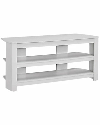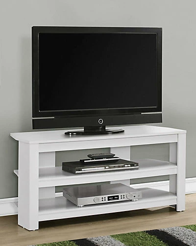 - Design details: Made from particle board, laminate; Two open concept shelves for audio visual components, gaming devices; Accommodates all TV sizes with a center stand; Crisp white finish; Contemporary/Transitional style blends well with any decor