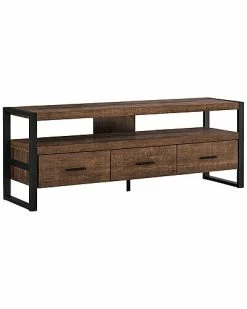 - Bring an industrial-inspired style to your entertainment space with this low-profile open back TV stand. The bold design starts with strong black satin metal supports at each end and in the center, and with thick paneled 60-inch-long shelving that can hold any size TV once centered. Finished in a warm brown reclaimed wood-look, this TV stand features a long open shelf to place your audio/visual equipment or a sound bar. The three closed drawers on smooth metal glides, are accented with sleek black handles, roomy enough to store all your accessories, keeping everything organized in one place but out of sight. Assembly is required.