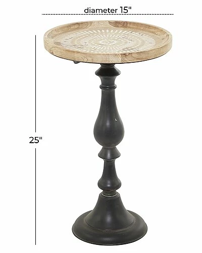 - Useful and elegant, side tables are more than just a place to throw your mail or place a lamp. A compact friendly table providing you with additional surface storage space any where in your home. Introduce a new element into any room with this brown and black pedestal table that can add the right dose of style to your interior. This item ships in 1 carton. Suitable for indoor use only. Holds up to 100 pounds. Farmhouse style. Enhance your farmhouse inspired home with classic style and a touch of cozy appeal. Farmhouse accent table crafted of solid and quality iron and wood materials. Decorative accent table that comes in brown surface with white abstract pattern and black pedestal stand. Round wooden side table features exposed wood grain and white abstract pattern top with raised border for a secure surface display. Item measures 15″L x 15″W x 25″H and weighs 9 lbs