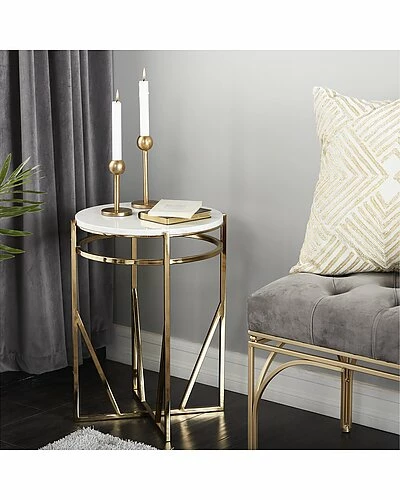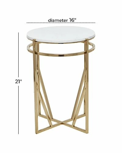 - This contemporary accent table gives multi-functional effects that will keep your space organized and stylish. A compact friendly table providing you with additional storage space any where in your home. Useful and elegant, side tables are more than just a place to throw your mail or place a lamp. This item comes shipped in one carton. The white round marble top is mounted on welded open-designed geometric base. Suitable for indoor use only. Marble is a product of nature and no two pieces are exactly alike, it is prone to variations in color and/or patterns in the material that adds to the beauty and charm of the piece. Contemporary theme. Maximum weight limit is 250 lbs.