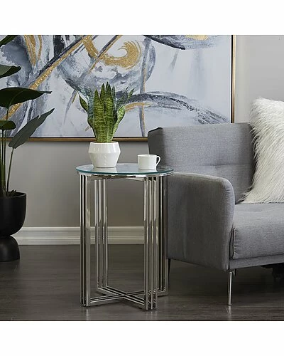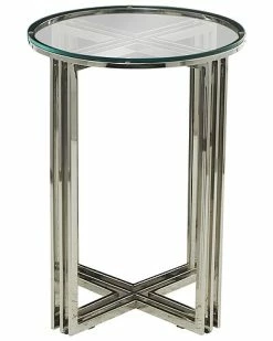 - Introduce a new element into your space by displaying this glass and stainless steel accent table in your living room or bedroom, with a ceramic vase or planter on top. Designed with black rubber stoppers at the base that prevent scratching the floor, as well as sliding around. This item ships in 1 carton. Suitable for indoor use only. Maximum weight limit is 100 lbs. Contemporary style. A contemporary style offers neutral elements and basic forms with a bold design. Decorative silver accent table is made of quality stainless steel and tempered glass. Minimalistic decorative accent table features a transparent table top, and a shiny silver, stainless steel body. Sophisticated round side table brings extra display space to your room, and features an open body design for a more spacious appeal. Silver accent table measures 18OD x 25OH and weighs 22 lbs