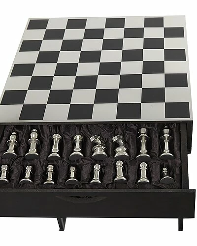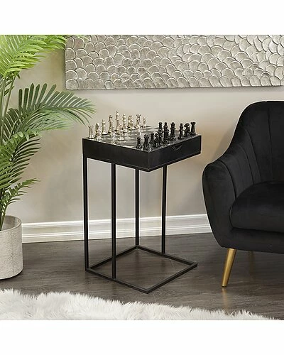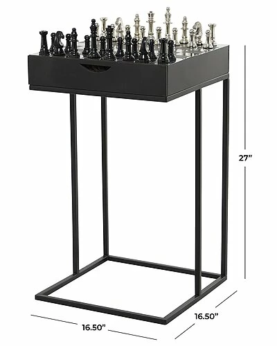 - Useful and elegant, side tables are more than just a place to throw your mail or place a lamp. A compact friendly table providing you with additional surface storage space any where in your home. Elegant chess set side table that can work well as a display or board game in your living room, guest room, or office. This item ships in 1 carton. Chess set side table that comes with a single drawer for storing chess pieces with 15″L x 15″W x 2″H measurements. Suitable for indoor use only. Holds up to 100 pounds. Contemporary style. A contemporary style offers neutral elements and basic forms with a bold design. Square chess set side table made of quality and long-lasting aluminum, iron, wood, and stainless steel materials. Decorative board game accent table featuring black and silver finishes perfect for an elegant contemporary interior. Black and silver c-shaped accent table featuring a square checkered chess set board with a pull-out drawer for storing complete chess pieces in a glossy coating. Chess table measures 16.50OL x 16.50OW x 27OH and weighs 27.50 lbs