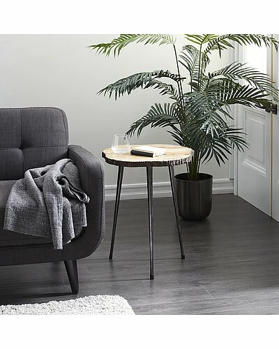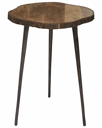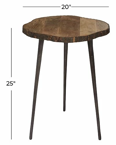 - Bring a finishing touch to your home with an inviting appeal with this beautifully crafted accent table. A compact friendly table providing you with additional surface storage space any where in your home. Decorate this teak wood table next to an upholstered armed chair with light colored pillows for a cozy reading moment. Designed with rubber stoppers at the base that prevent scratching furniture and table tops, as well as sliding around. This item ships in 1 carton. Suitable for indoor use only. 100 lbs. max weight limit. Rustic style. A rustic inspired piece is natural in design, and fills the home with a relaxed and warm ambiance. Tree bark accent table showcases a sturdy construction of mango tree wood and aluminum. Round tripod table features warm brown natural wood finish and dark gunmetal legs. Rustic wooden end table features a slice of tree trunk tabletop and tapered metal tripod legs. Tree slice table measures 25″L x 25″W x 24.75″H and weighs 13 lbs