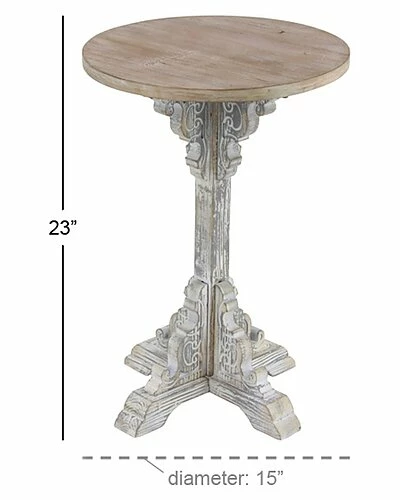 - Bring a finishing touch to your home with an inviting appeal with this beautifully crafted accent table. A compact friendly table providing you with additional surface storage space any where in your home. Wood accent table are best displayed near upholstered sofa or canopy beds with books or dried artificial plants for perfect rustic feel. This item ships in 1 carton. Suitable for indoor use only. Some assembly required. Maximum weight limit is 100 lbs. Farmhouse style. Crafted to offer any farmhouse or country cottage themed home a final touch with a cozy rustic appeal. Side table is made from solid wood materials for durable and long lasting structure. A round accents table features a dark brown top with white base and grey distressing. Pedestal side table features intricately carved floral leg stand in an X-shape structure with a slight elevated base and a simple solid top. This item measures 15L x 15W x 23H; weight 3.0 lbs
