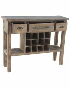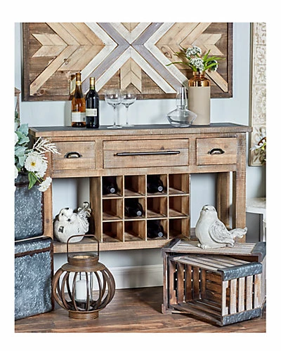 - Rustic Reflections wood and wine console, features a rectangular brown frame with wine bottle slots in the middle, has three slide-out drawers with bar and cup pulls