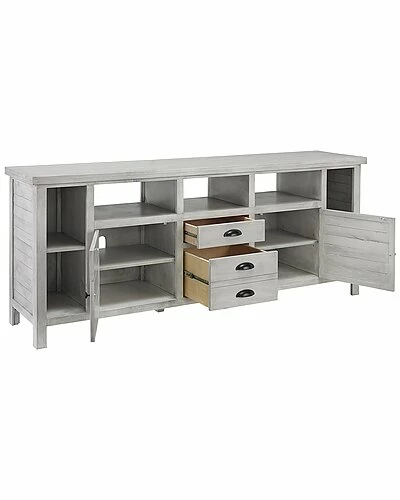 - Decorative storage solutions for your living and entertainment areas are an easy choice with this console. It features two drawers and two doors with adjustable shelving behind and open areas at top.