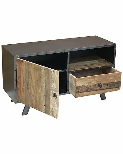 - Smart, cool, and functional is key. A transitional style with an industrial feel. Simple, straight-edge, gun metal gray iron frame with contrast reclaimed wood drawers and cabinet. Modern shaped splayed legs introduces a little drama to the mix. Drawers and cabinet made from reclaimed wood adds not only a rustic look but texture as well. A great spacious open shelf provides a perfect area for storage or display. Your living room, bedroom, home office, or wherever you decide to use this chic little number, will never be the same. The matching nightstand is just icing on the cake.