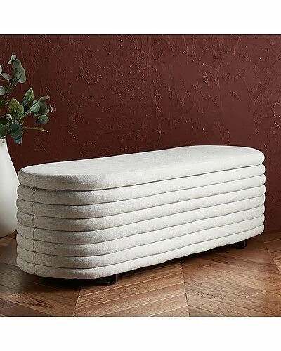 - Bring a dose of style and convenience to your home with the Jaymie storage bench. The modern silhouette of the bench is enlivened with bold, voluminous folds to feature as an artful accent for your home. the graceful bench is softened with sweeping curves at each end to present an oval and comfy seat for any corner of your home. Expertly tailored in linen with birchwood legs, the bench conveniently lifts to store your throws, pillows, and out-of-season clothing in a living room, entryway, or bedroom.