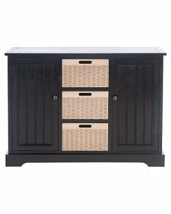 - Classically designed to suit any decor, this Landers 2 Door Console brings storage and style to any busy entryway, hall, or living room. Landers clean lined frame is given a modern touch with a sleek black finish and three natural toned baskets.