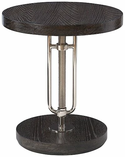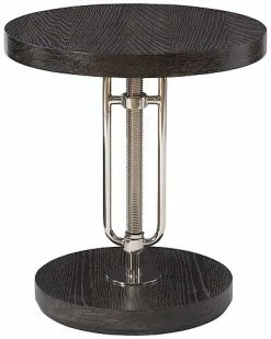 - Design details: featuring an industrial support in stainless steel finished in polished nickel, paired with a contrasting oak veneer top and base stained in ebony with a light gray glazing. The swivel mechanism is fully functional and adjusts from 20in to 29in.