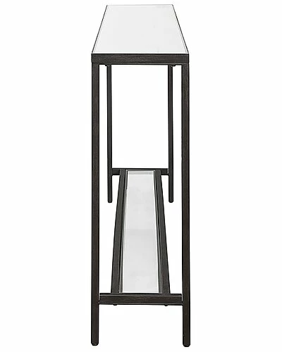 - Design details: classic and minimalistic, this narrow console table in steel is finished with a streamlined rustic black, inset with a beveled mirrored top, and gallery shelf in clear glass.