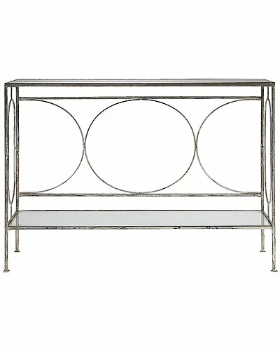 - Design details: refined, thinly shaped forged iron is finished in heavily distressed antique silver; top shelf is mirrored with a clear tempered glass gallery shelf.