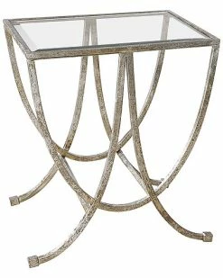 - Design details: gracefully curved in hand forged iron and finished in antiqued silver leaf; top is clear tempered glass.