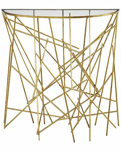 - Modern With A Classic Feel, This Demilune Console Is Perfect For A Smaller Space Or Entryway. The Abstract Sculptural Base Is Constructed From Iron Rods That Are Individually Finished In A Timeless Antique Gold With A Clear Tempered Glass Top.