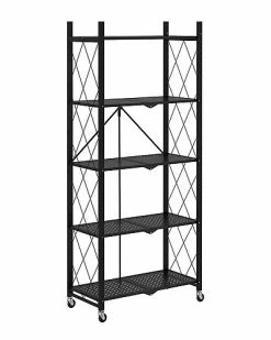 - Super versatile foldable metal shelf,Quick and easy folding design, opens up and locks into place; no assembly is required,Wheels provide ease of movement, lock into place for added stability,Ample shelf space on multiple tiers for plenty of storage,Approximate weight capacity for top shelf is 65 lbs, for shelves is 45 lbs