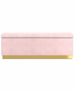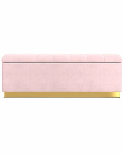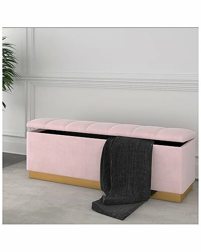 - Modern bench with spacious storage compartment,Safety stop hinges keep seat from slamming shut,Rich velvet upholstery with panel stitching detail,Sturdy wood base wrapped in gold faux leather,Approximate weight capacity is 400 lbs